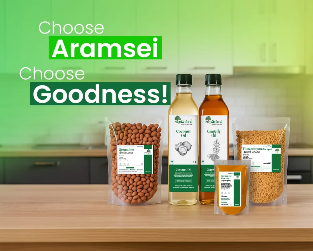 From cold-pressed oils and ancient millets to traditional rice, pulses, sweeteners, and dairy, Aram Sei brings you nature’s best in its purest form. No chemicals. No shortcuts. Just honest, wholesome goodness for everyday living.