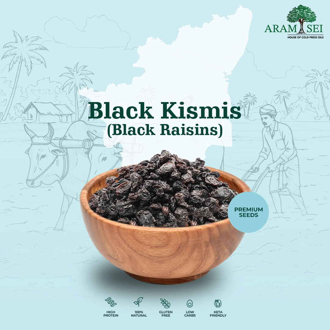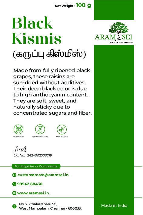 Made from fully ripened black grapes, these raisins are sun-dried without additives. Their deep black color is due to high anthocyanin content. They are soft, sweet, and naturally sticky due to concentrated sugars and fiber. Excellent for baking, snacking, or steeping in water overnight.