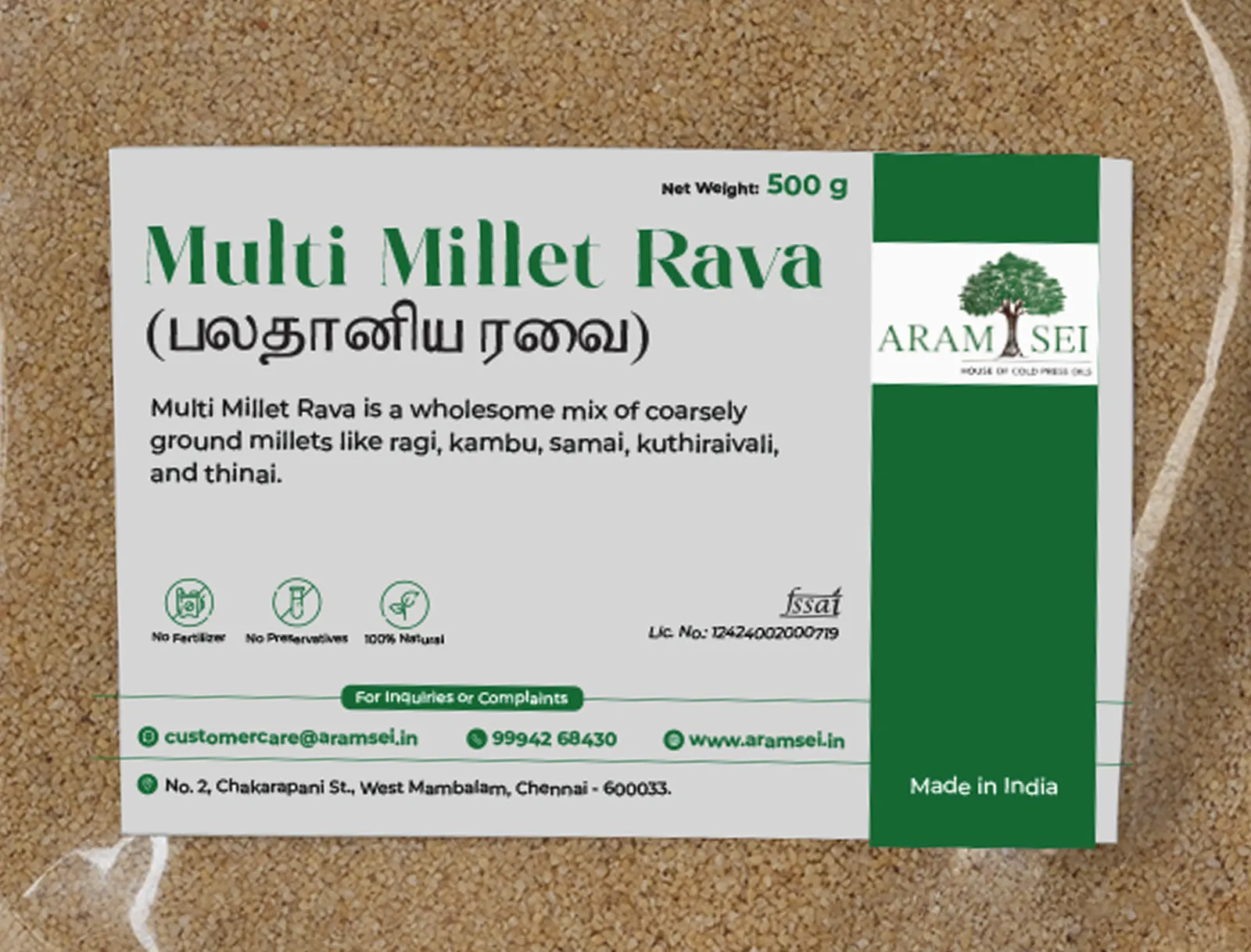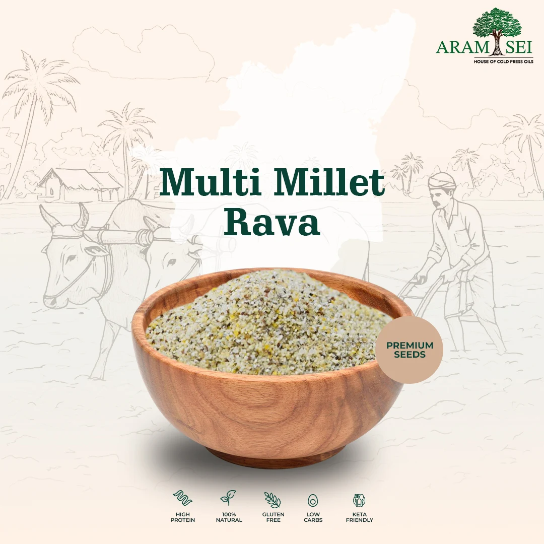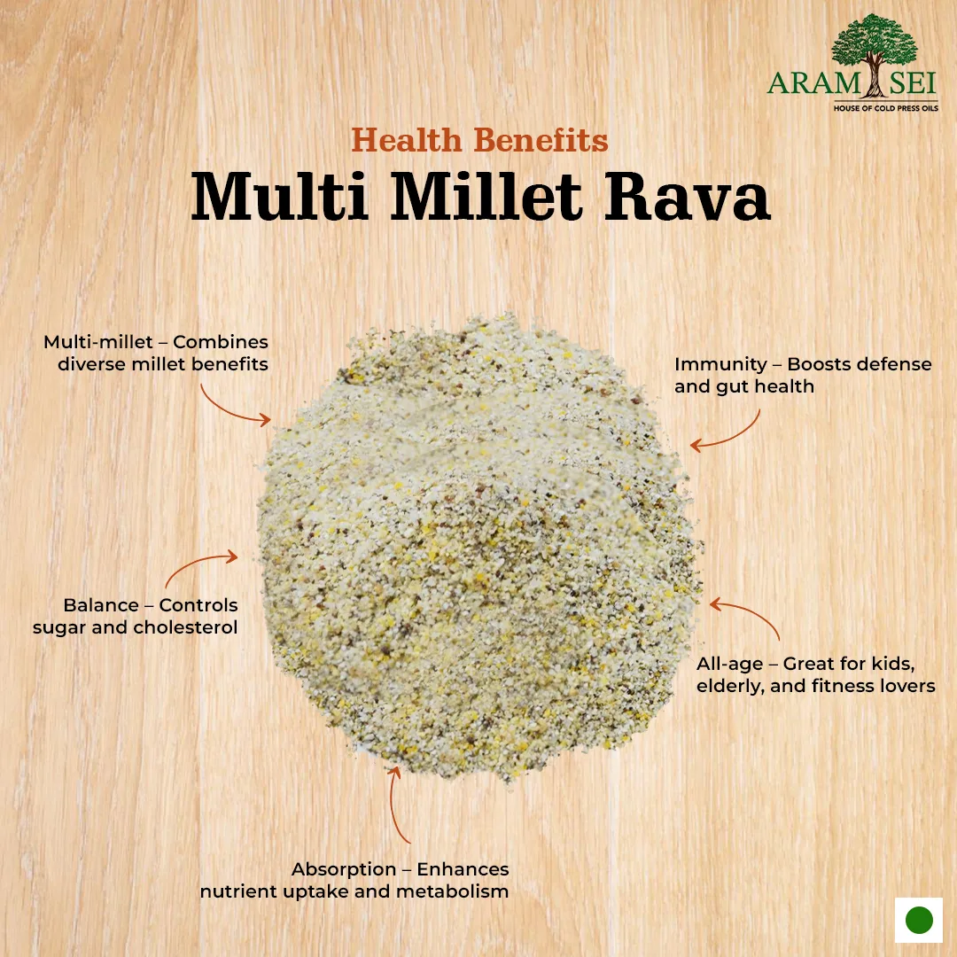 Multi Millet Rava is a wholesome mix of coarsely ground millets like ragi, kambu, samai, kuthiraivali, and thinai. This multigrain rava has a varied texture and a nutty, hearty taste, making it ideal for nutrient-dense meals.