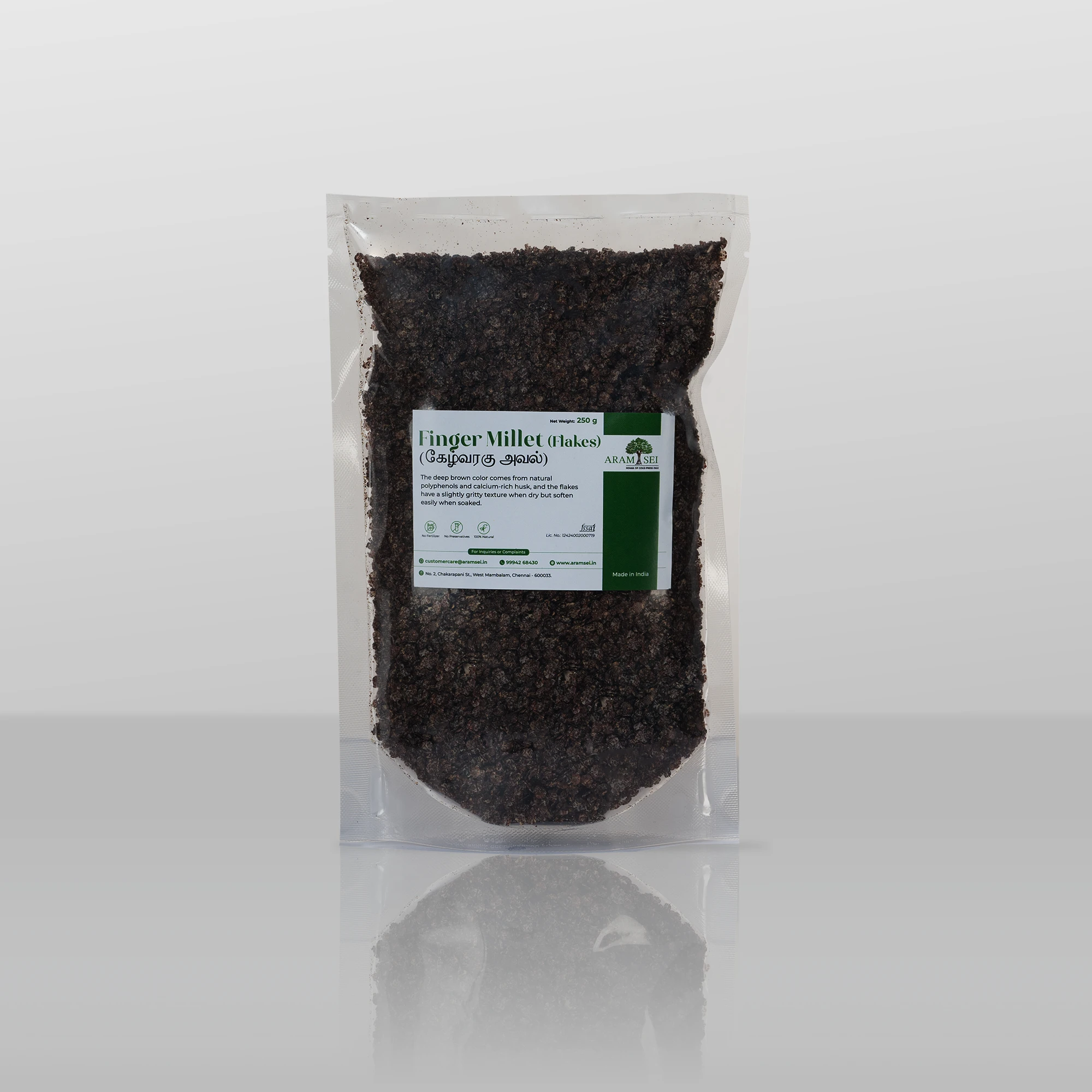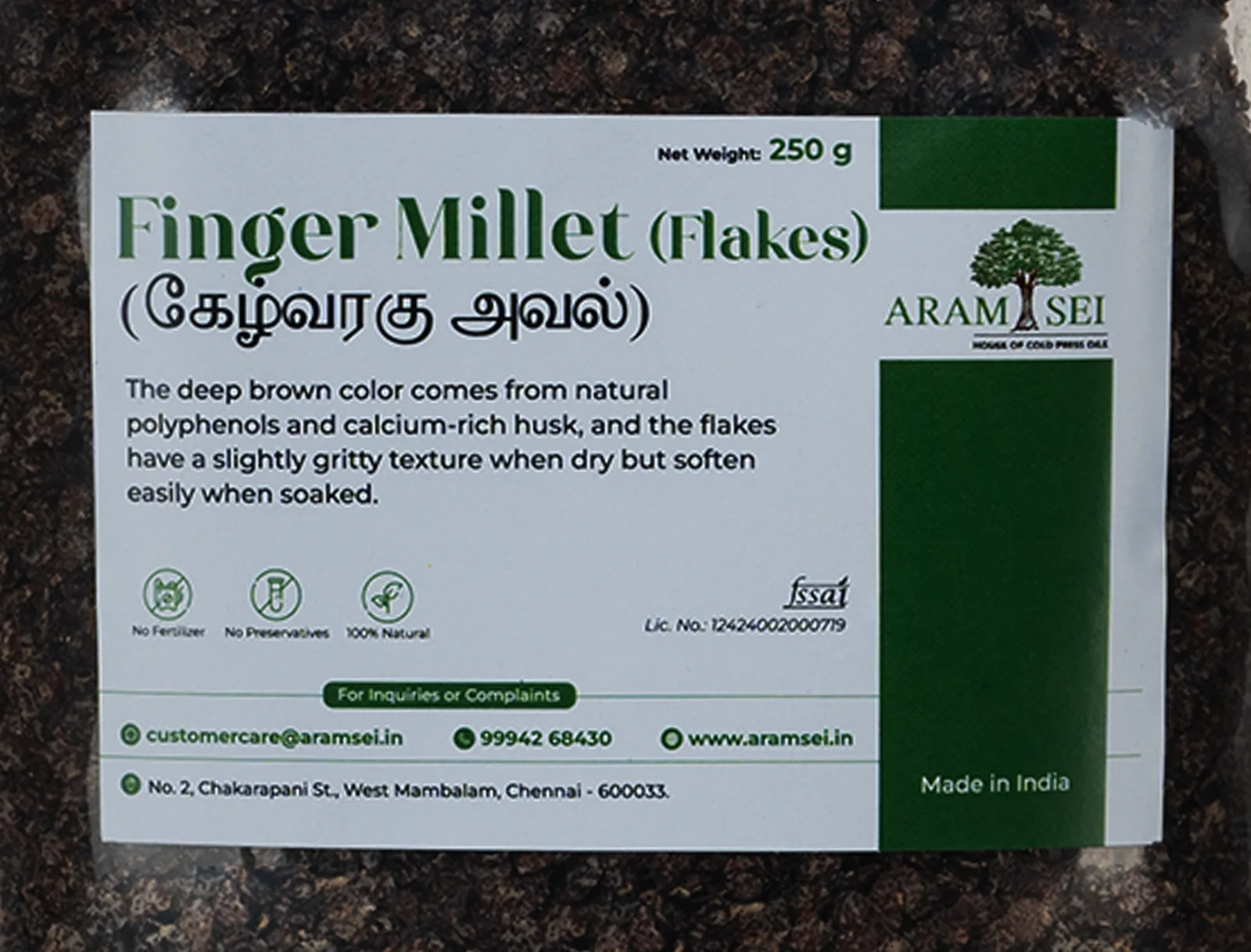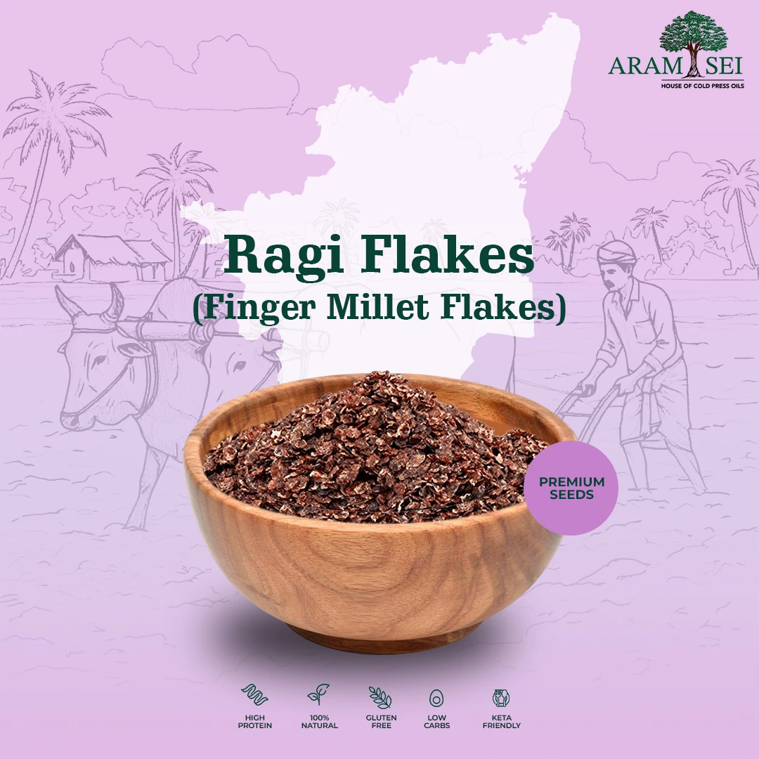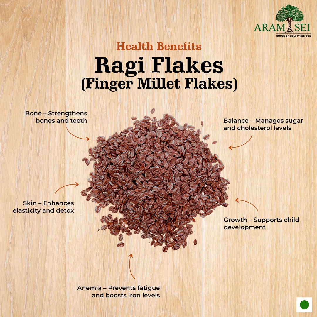 Ragi flakes are made by gently steaming finger millet and then flattening it to preserve its nutritional value. The deep brown color comes from natural polyphenols and calcium-rich husk, and the flakes have a slightly gritty texture when dry but soften easily when soaked.